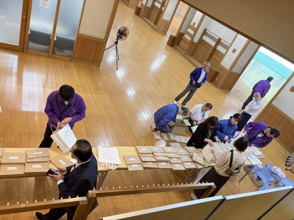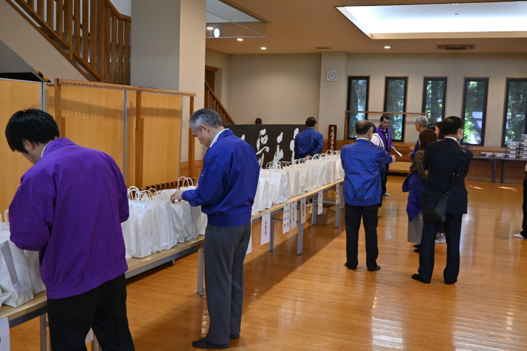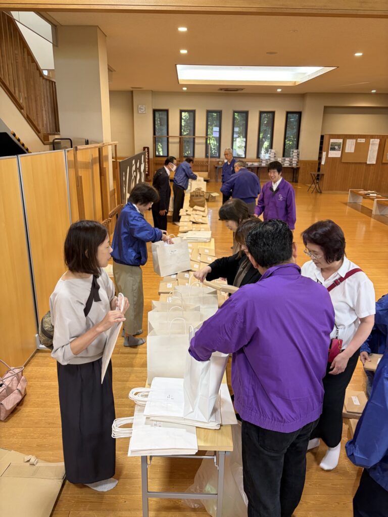 大会役員が協力して大会パンフレット・記念品等の仕分け作業を行っています。