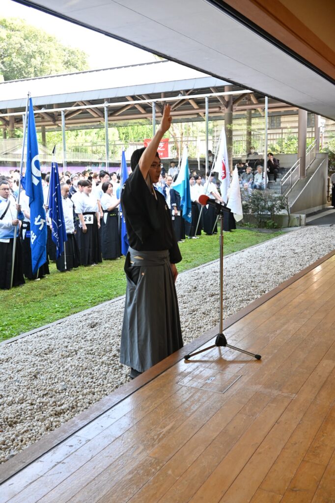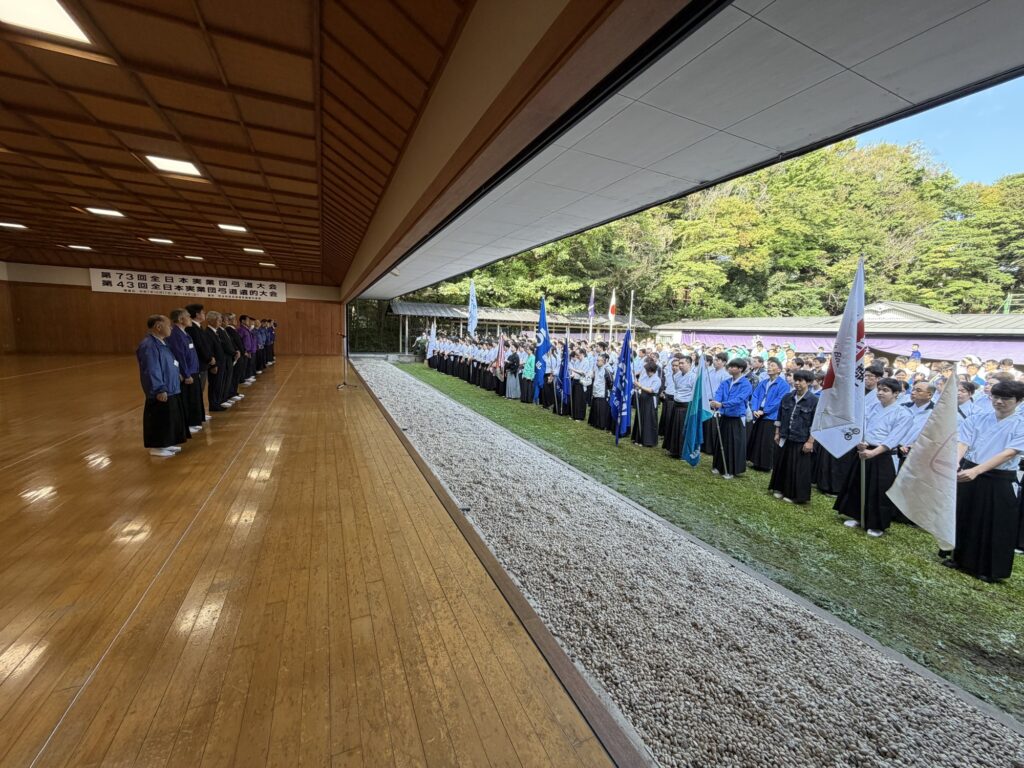 秋晴れの空の下、明治神宮弓道場で大会開会式が行われました